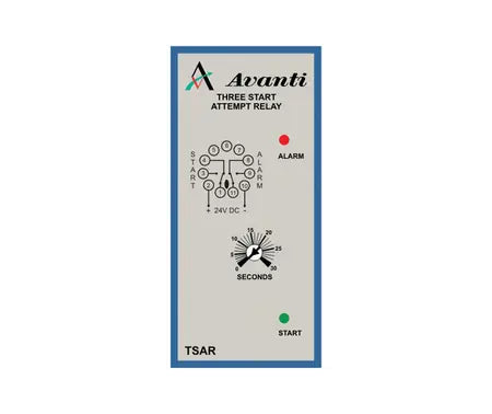 To start generating sets up to maximum of 3 attempts. On power up the relay energises for the pre-set time. With a successful start the power must be removed. On failure to start the relay de-energises for the same pre-set time. The second and the third attempt will be made in the same manner. If failure persists after 3 attempts an alarm relay is energised. |